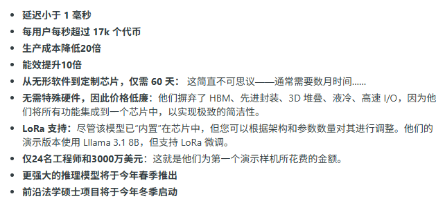 最近新出现的方案,groq、cerebras等等,不论是审美tpu、npu还是什么pu,还是拘泥于传统思路,降本增效,不论是从x86换成arm,还是增大核心规模,还是缩短带宽延迟等等,我认为都没有从硬件上下手来的实在,如果说这些厂商在做的是在超越摩尔定律,那我觉得taalas的方案就是在颠覆摩尔定律。