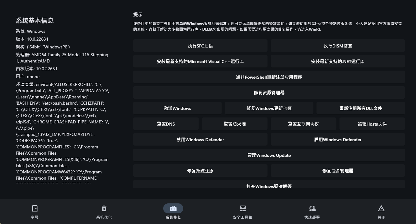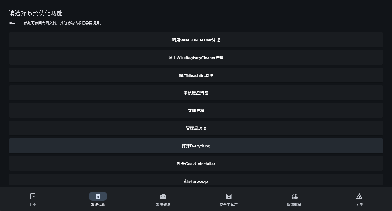 程序当前为测试版,包含快捷方便的简单系统维护、安全审计等功能,后续功能会慢慢添加